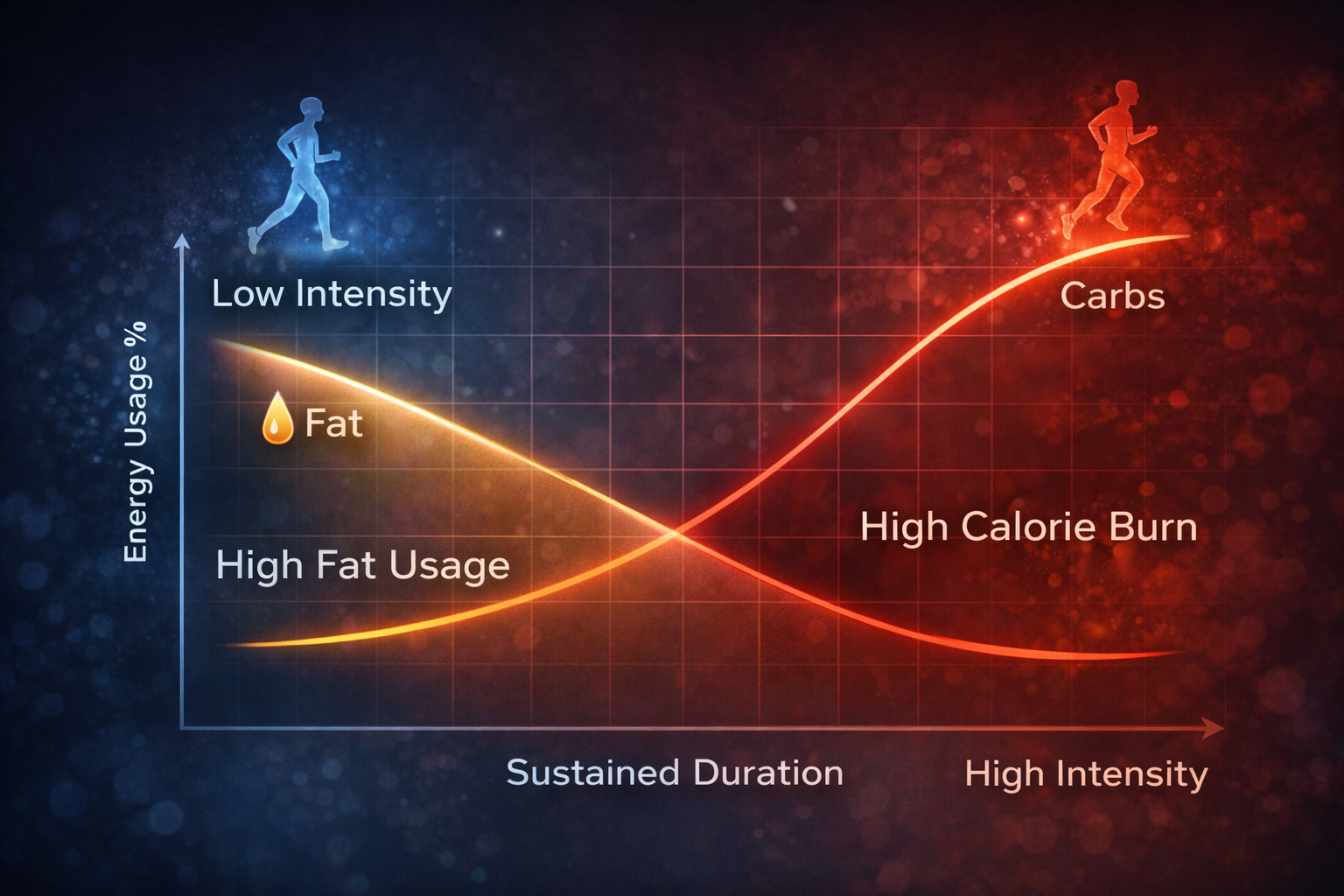 운동 강도가 올라갈수록 단위 시간당 에너지 소비 속도는 증가한다. 하지만 이 에너지를 어떤 연료에서 가져오는지는 운동 강도에 따라 달라진다.